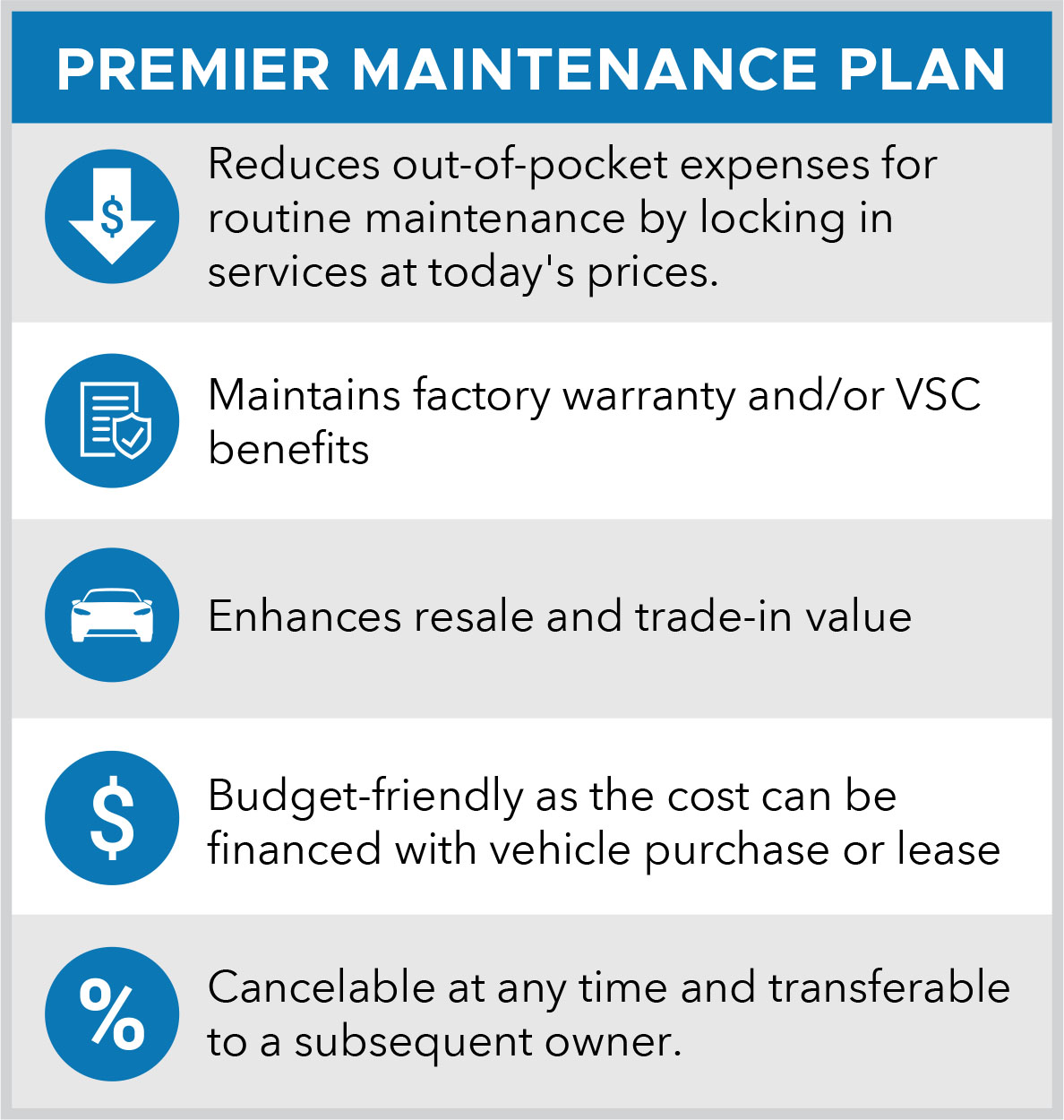 Premier Maintenance Plans help simplify your vehicle's maintenance needs by allowing you to have multiple services performed at the originating dealer by factory-trained technicians, including services which may be required by the vehicle manufacturer.